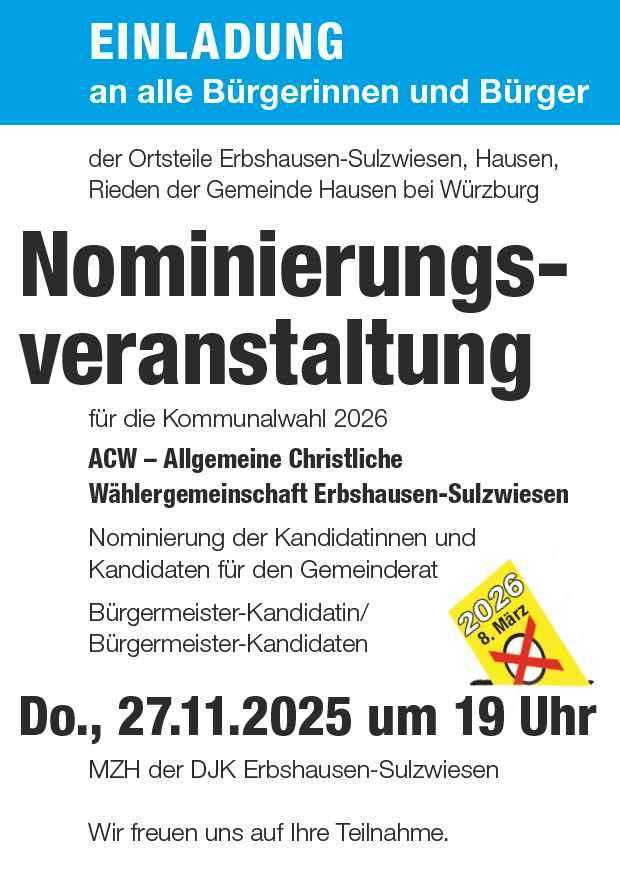 Alle Bürgerinnen und Bürger sind herzlich eingeladen, sich einzubringen, sich zu informieren, mitzuwirken und den weiteren Weg der ACW – Allgemeine Christliche Wählergemeinschaft – Liste für Erbshausen-Sulzwiesen aktiv mitzugestalten.